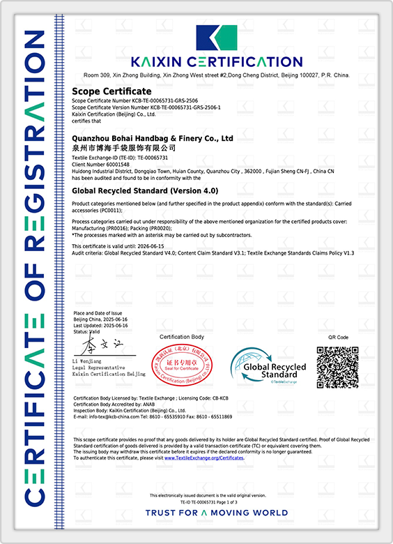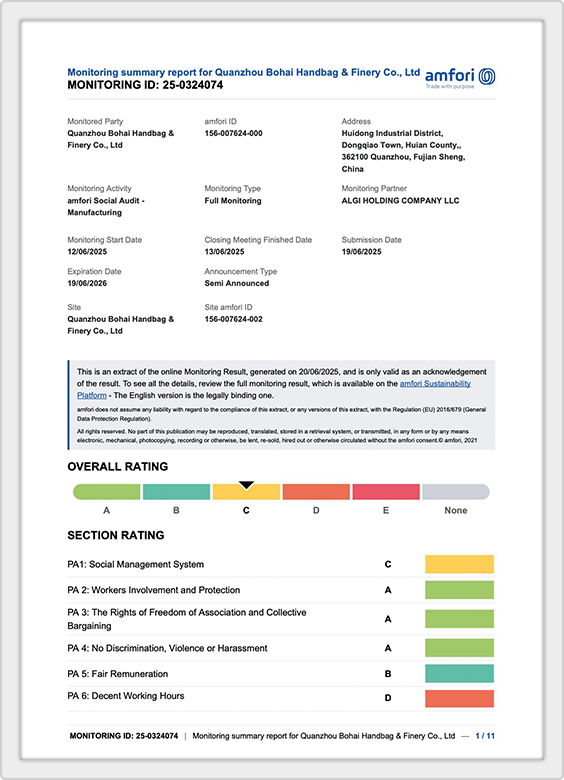 Our production processes meet the stringent inspection requirements of various international standards and certifications, including ISO 9001:2015, BSCI, SEDAX, WM, MGB, SWISSGEAR, and others.
